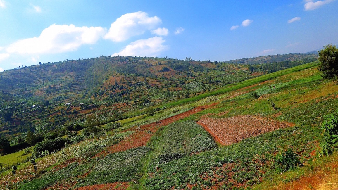 From here our drive took us though rolling hills with scattered green trees. Today was mainly about driving so I busied myself with this Post 28 and doing Solo 12 expenses and backups. Even though we had risen to 1400m by noon it was very warm with some humidity given the clear sky and strong equatorial sun. About two hours out of Kabale (Pop 41,000) we started to climb topping 2200m with terrific lush valleys below us on both sides of the ridge. Farms and farm houses clung to the sides of the mountains forming the valleys and the sunlight poured through the spaces between clouds like laser beams. Great sight. We arrived in Kabale at 4pm and spent 30min doing last minute shopping.